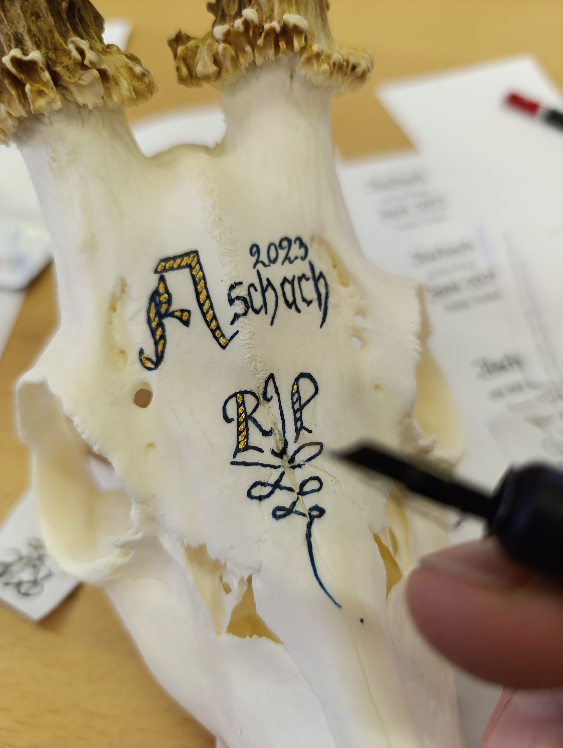 Eine weitere faszinierende, kunstvolle Inszenierung ist das Bemalen der Trophäe mit Tusche – hier gibt es unzählige Möglichkeiten, der eigenen Kreativität freien Lauf zu lassen. Grundlegende Fertigkeiten der Kalligrafie sind dank moderner Technik nicht zwingend nötig. Mit qualitativ hochwertiger Tusche und einer gut vorbereiteten Trophäe ist der Grundstein bereits bestens gelegt! Jedoch empfiehlt es sich, ein Trophäenbeschriftungs-Seminar zu besuchen, um gewisse Techniken zu erlernen. Eine persönliche Empfehlung ist hier das Atelier Rauscher aus Bayern (https://www.kunsthandwerk.bayern/). Solch Erinnerungsstücke selbst zu gestalten ist auch ein Teil der Jagd.