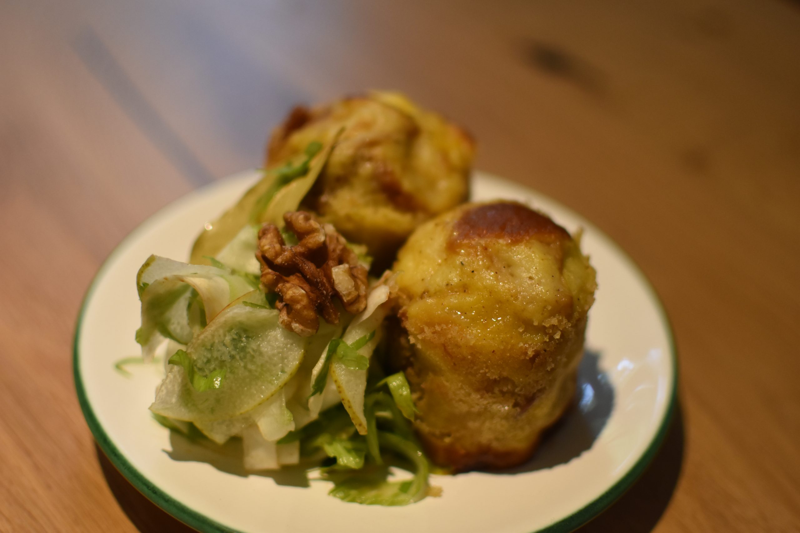 Den Brioche würfeln und mit der Milch vermengen. In die geschmolzene Butter, die Eierdotter einrühren und unter die Briochemasse heben. Das Eiweiß zu cremigem Schnee schlagen und unterheben. Würzen und in bereits befettete Förmchen füllen. Bei 160 °C Heißluft ca. 20 – 30 Minuten goldbraun backen. Alternativ im Dampfgarer oder Thermomixaufsatz dämpfen. Den Knödel stürzen und anrichten.