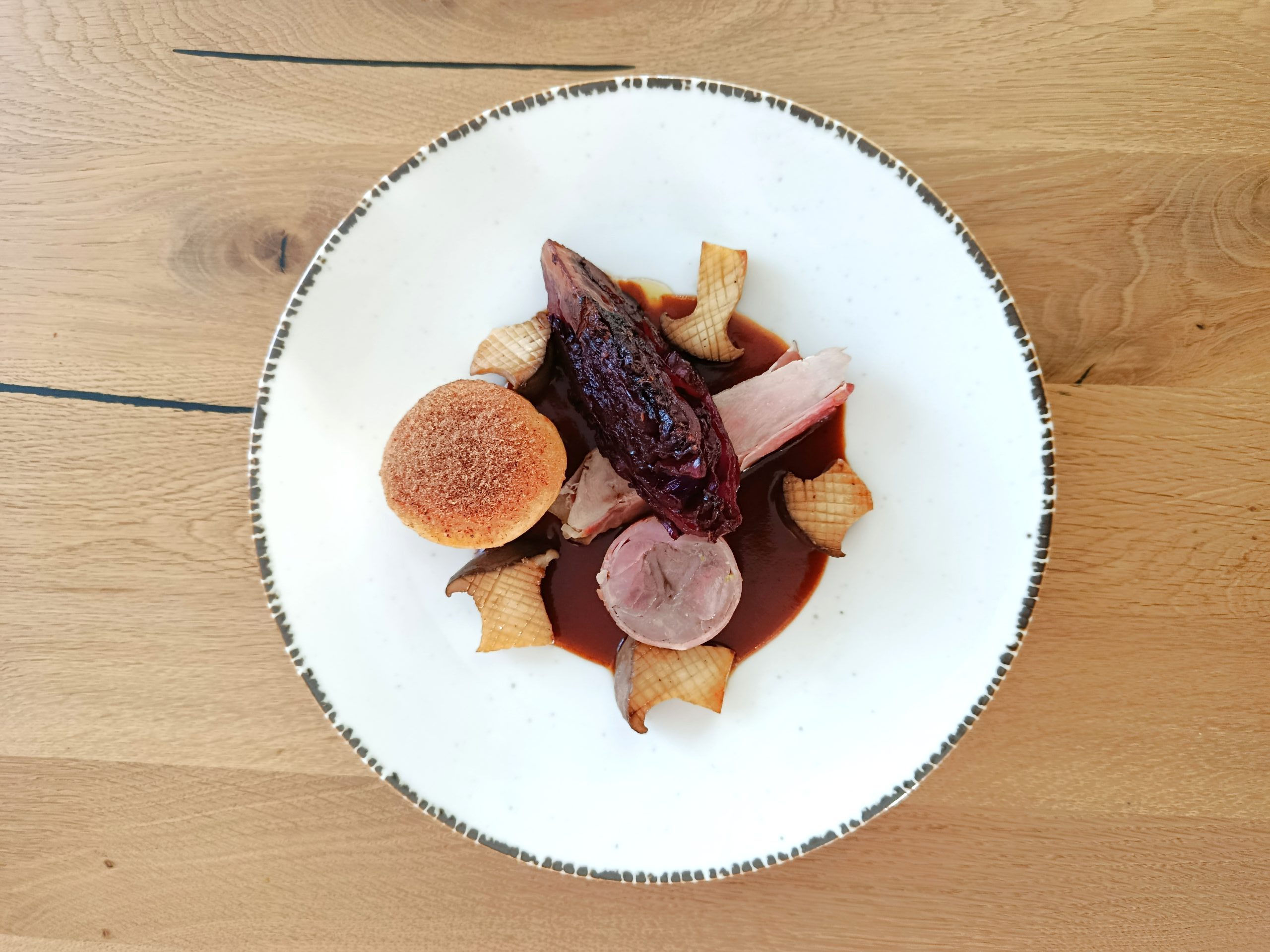 Kartoffelbuchtel, Pilze und karamellisiertes Stöckl-Rotkraut