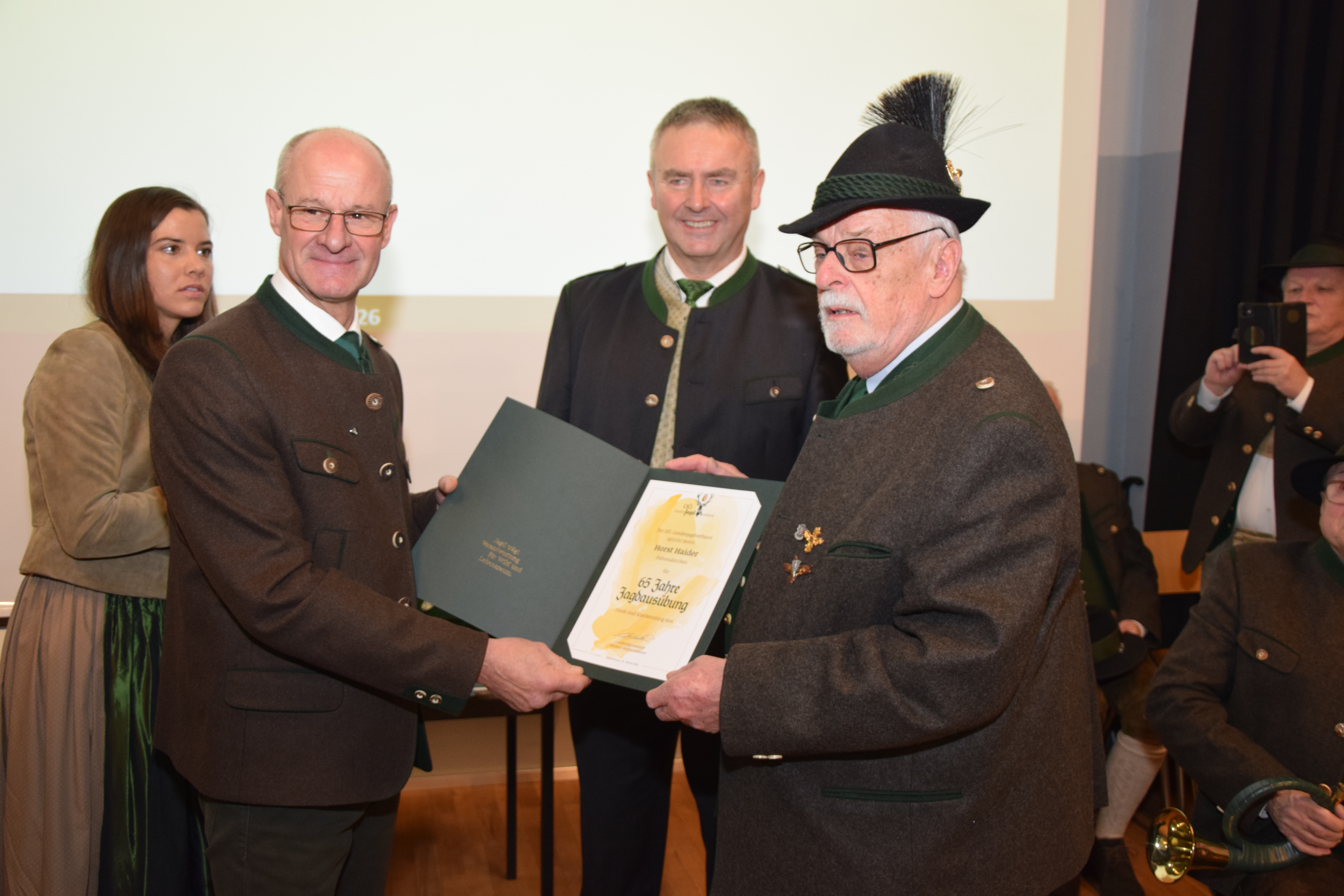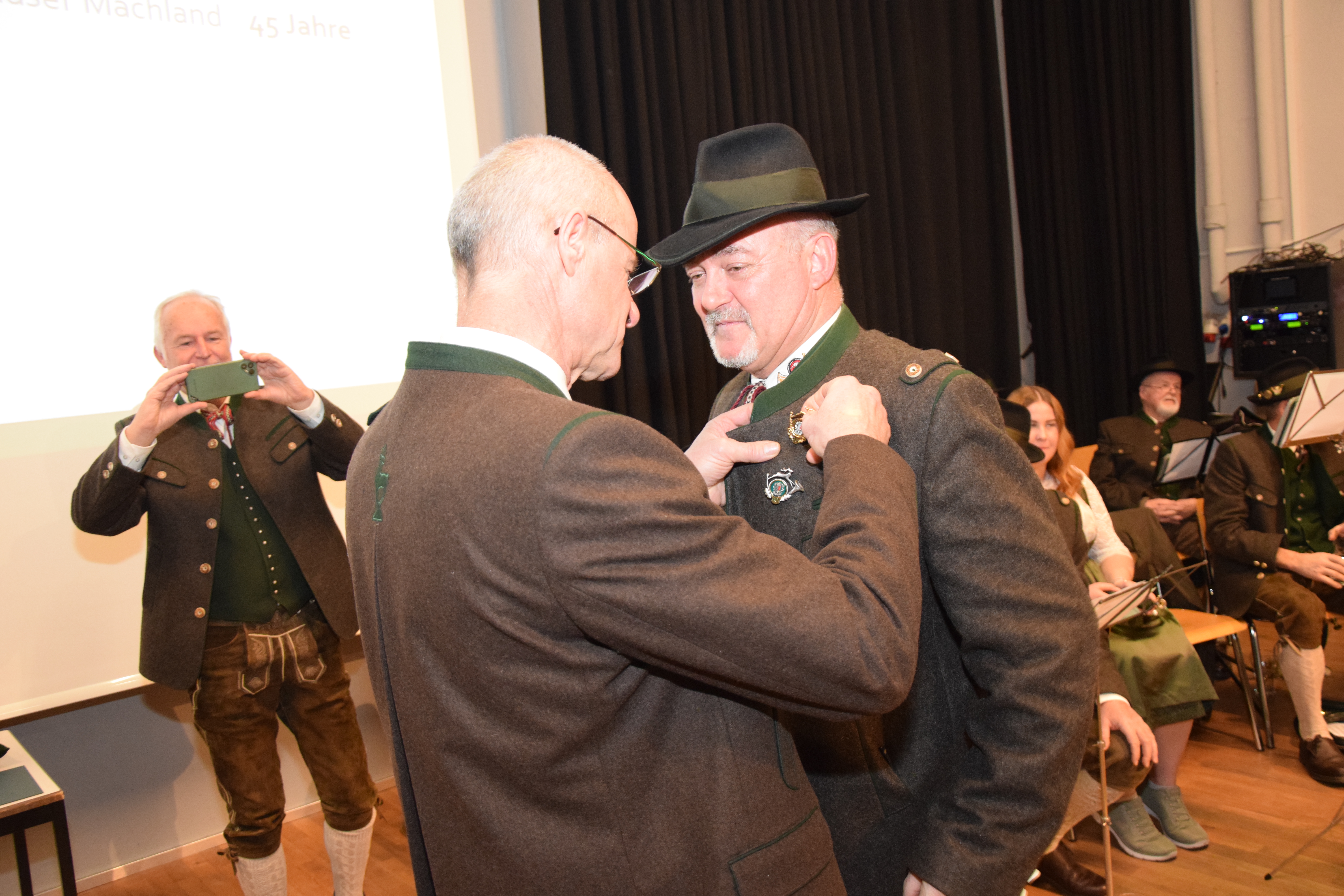 Jagdhornbläser-Abzeichen (alle JHBG Machland): 25 Jahre: Josef Killinger, Anton Lehbrunner, Anton Böhm; 45 Jahre: Christian Penner; 50 Jahre: Johann Mayrhofer; OSR Ernst Grüll