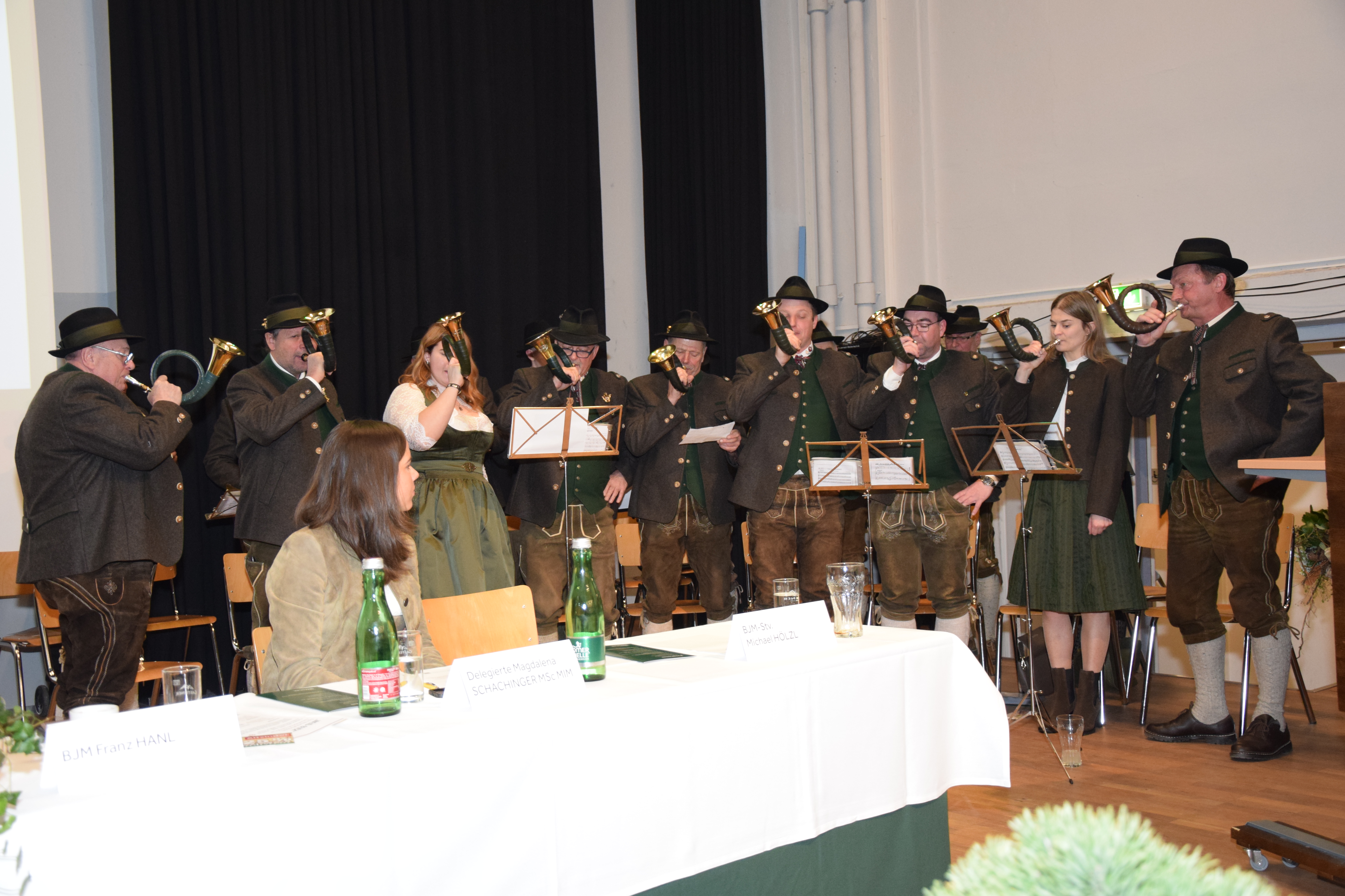 Unter den Klängen der Jagdhornbläsergruppe Machland begrüßte BJM Franz Hanl zahlreiche Jägerinnen und Jäger sowie die Ehrengäste aus der Politik, darunter den Hausherrn und Bürgermeister der Stadt Perg, LAbg. BGM Anton Froschauer, sowie Landesrätin Michaela Langer-Weninger, PMM. Die Anwesenheit von LJM Herbert Sieghartsleitner, LJM-Stv. Ing. Andreas Gasselsberger, LJM-Stv. Ing. Volkmar Angermeier sowie mehrerer Bezirksjägermeisterkollegen, Mitglieder des Landesjagdausschusses und des Ehrenbezirksjägermeisters Dr. Ulf Krücklzeichnete die Veranstaltung aus.