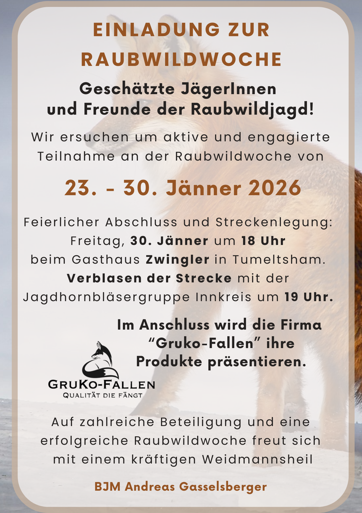 Termine Raubwildwoche von 23. – 30. Jänner 2026 Bezirksjägertag am 7. Februar 2026 Krähenjagdwoche von 13. – 20. März 2026