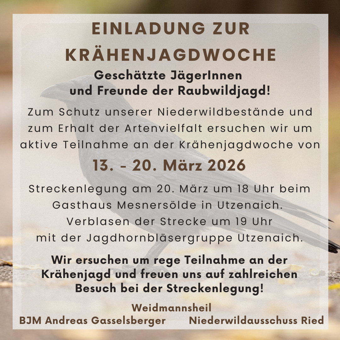 Termine Krähenjagdwoche von 13. – 20. März 2026 Mostkost der Jagdgesellschaft Taiskirchen am 21. März 2026 Jagdleitersitzung am 22. April 2026 Jungjägerprüfung von 27. – 29. April 2026