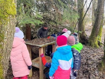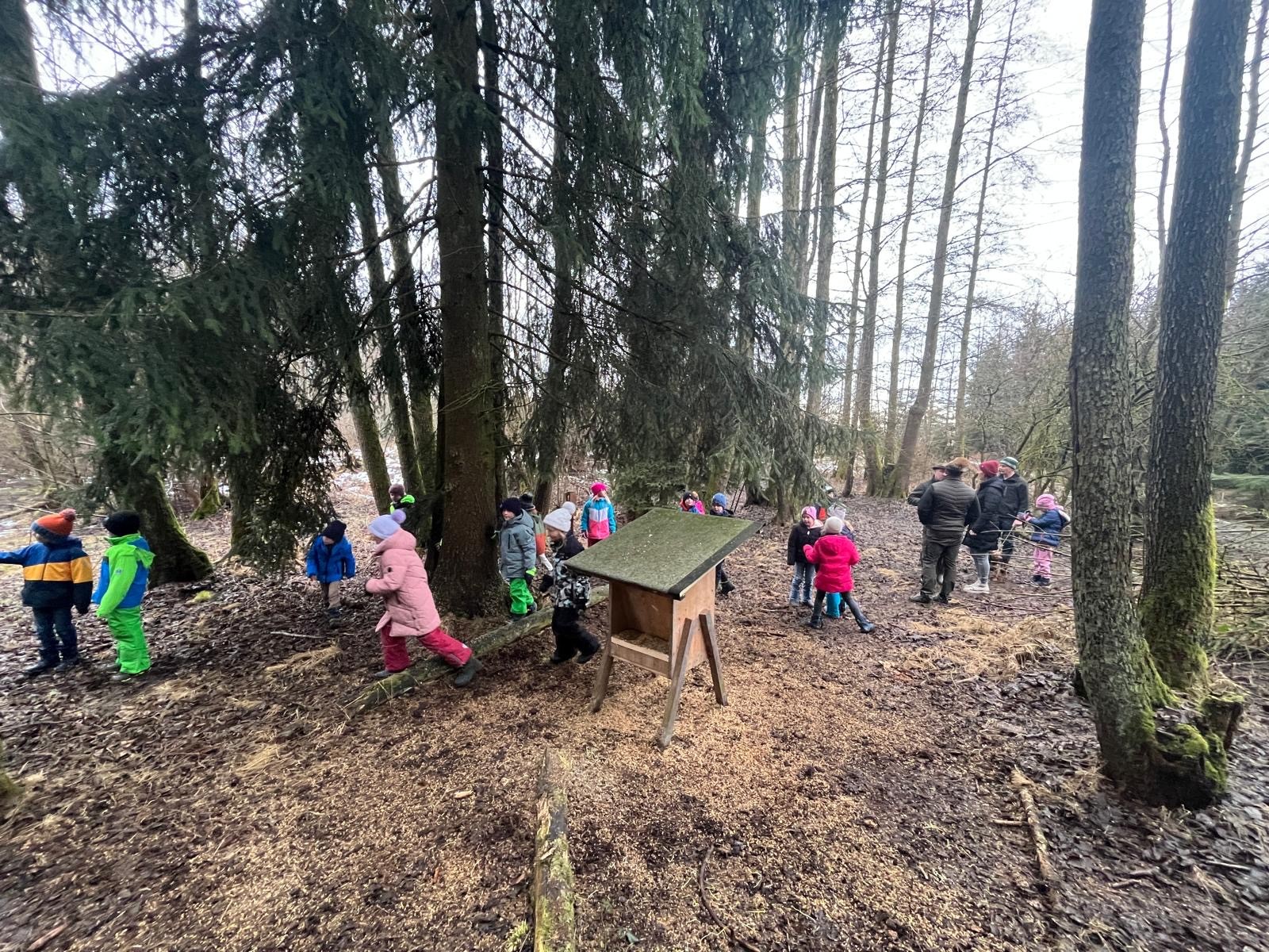 Im Anschluss ging es hinaus ins Revier, wo die Theorie lebendig wurde. Vor Ort erhielten die Kinder spannende Einblicke in verschiedene Reviereinrichtungen und lernten, welche Aufgaben Jägerinnen und Jäger im Jahreslauf übernehmen. Besonders hervorgehoben wurde die Bedeutung der Wildfütterung in der aktuellen Jahreszeit sowie der nachhaltige Gedanke hinter der Hege und Pflege der heimischen Wildbestände.