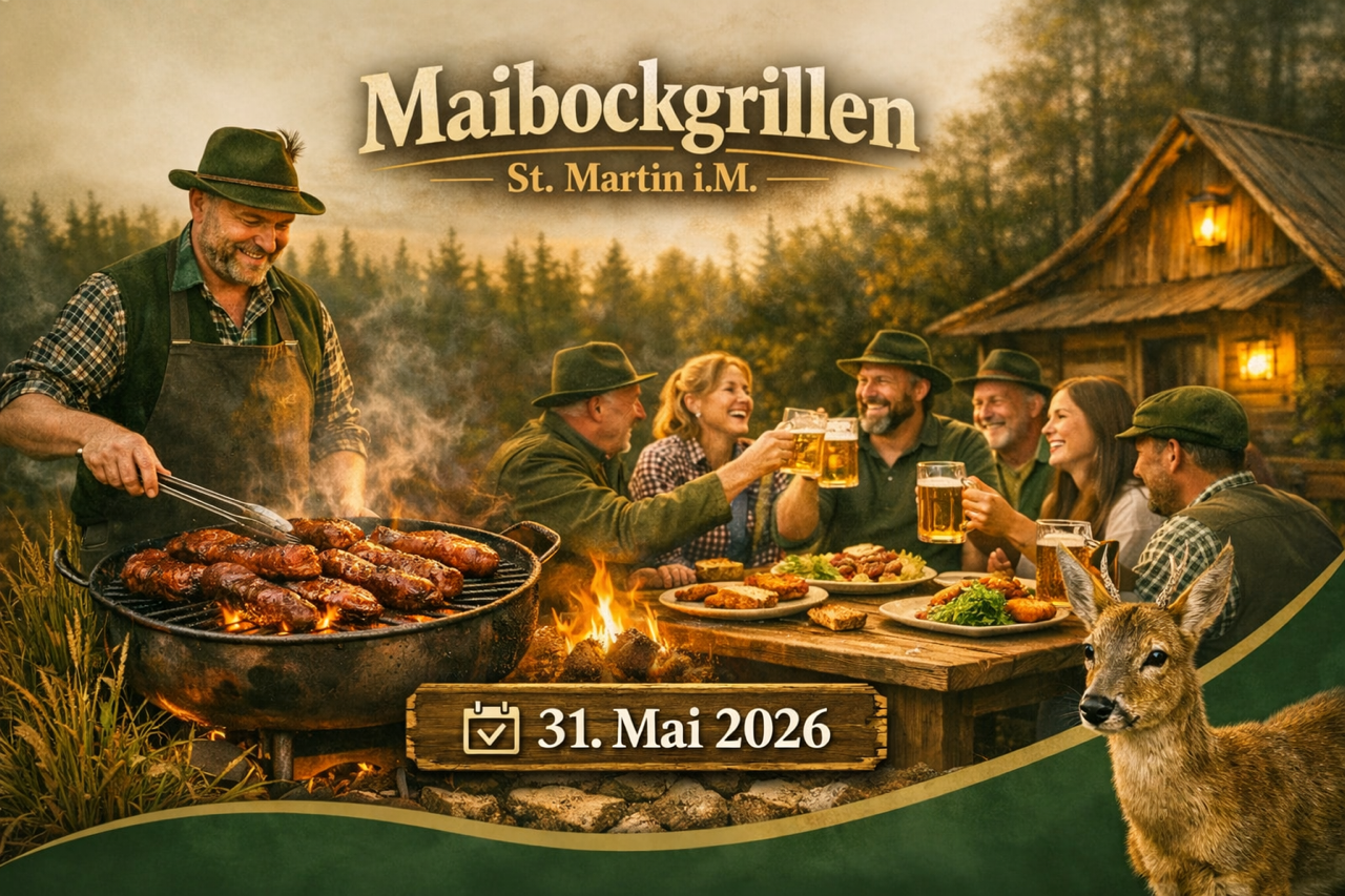 Maibock Grillen St. Martin i.M. 31. Mai 2026 Von 01.04.2025 bis 02.06.2025 am Sportgelände in St. Martin / Mkr. nähere Info bei Jagdleiter Paleczek Daniel 0664 4630053