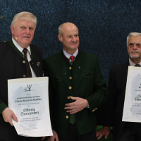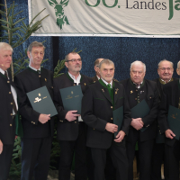 Ein zentraler Punkt der Veranstaltung war die Ehrung verdienter Jägerinnen und Jäger. Besondere Anerkennung erhielten mit dem silbernen Ehrenabzeichen des OÖ. Landesjagdverbandes BJM Franz Konrad Stadler und Leopold Wiesinger für ihre 12-jährige Tätigkeit im Landesjagdausschuss. Für 50-jährige („Goldener Bruch“)und 60-jährige aktive Jagdausübung wurden insgesamt 16 verdiente Weidmänner geehrte. Ebenso wurden herausragende Trophäen des vergangenen Jagdjahres prämiert.
