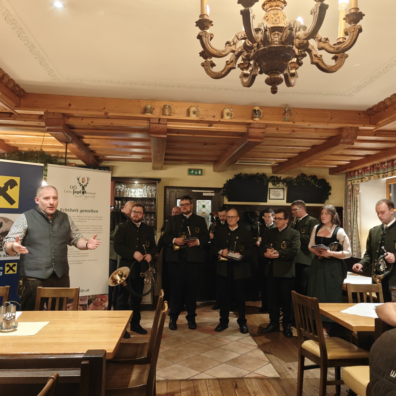 Die Verleihung der Wildbretplakette wurde feierlich von den Pramtaler Jagdhornbläsern umrahmt, deren jagdliche Klänge der Veranstaltung würdigen Glanz verliehen. Auch die örtlichen Jägerschaften waren zahlreich vertreten und ließen es sich nicht nehmen, dem Kirchenwirt ihre Wertschätzung und Anerkennung auszusprechen.