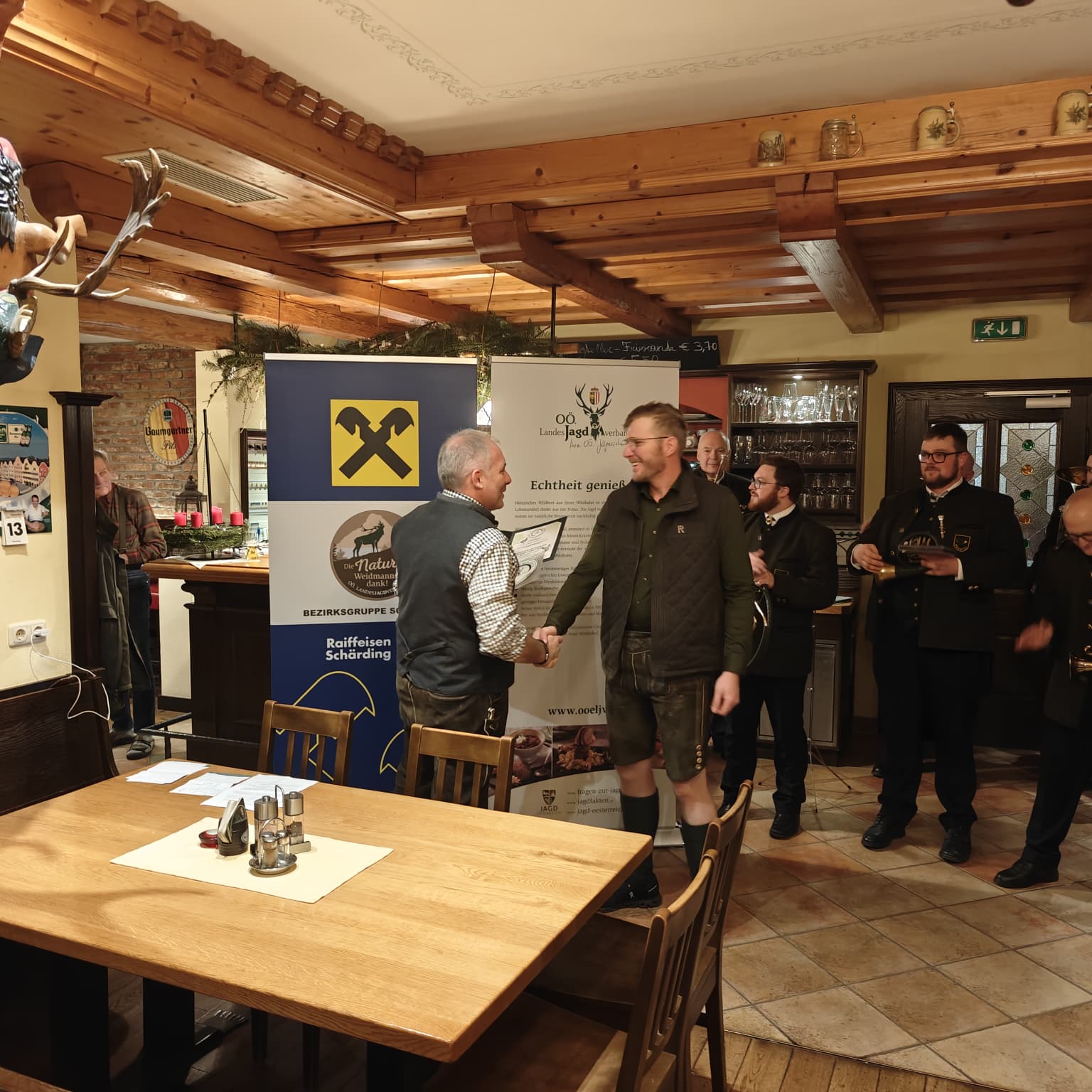 Die Verleihung der Wildbretplakette wurde feierlich von den Pramtaler Jagdhornbläsern umrahmt, deren jagdliche Klänge der Veranstaltung würdigen Glanz verliehen. Auch die örtlichen Jägerschaften waren zahlreich vertreten und ließen es sich nicht nehmen, dem Kirchenwirt ihre Wertschätzung und Anerkennung auszusprechen.