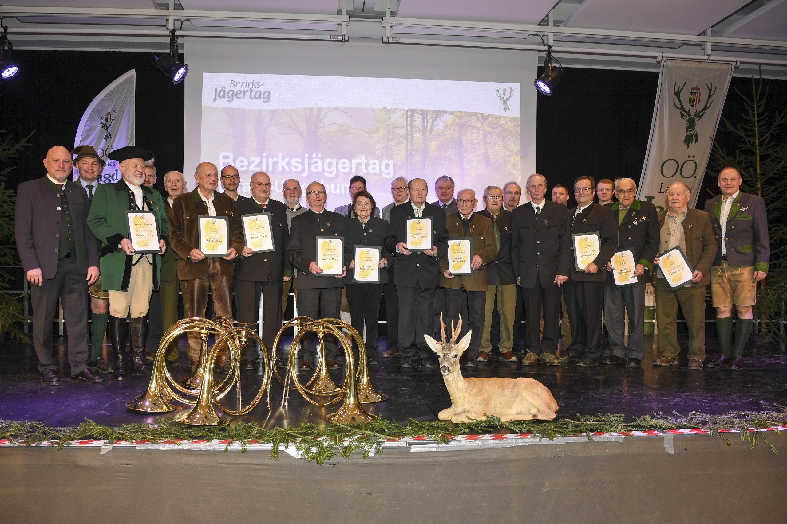 Viele Ehrengäste werteten die Veranstaltung auf, darunter Festredner Landtags-Präsident Max Hiegelsberger, Landesjägermeister-Stv. Andreas Gasselsberger, Bezirkshauptmann Ferdinand Watschinger mit Stellvertreterin Claudia Handlbauer und Forstchef Gerhard Aschauer, viele jagdliche Spitzenfunktionäre aus den Bezirken, Bezirksbauernkammer-Obmann Peter Preuer und Landesbäuerin Johanna Haider, die Spitzen der Blaulichtorganisationen mit BFK Johannes Enzenhofer, viele Bürgermeister mit Hausherr Friedrich Geyrhofer sowie zahlreiche Spitzenvertreter aus Verwaltung und Wirtschaft.