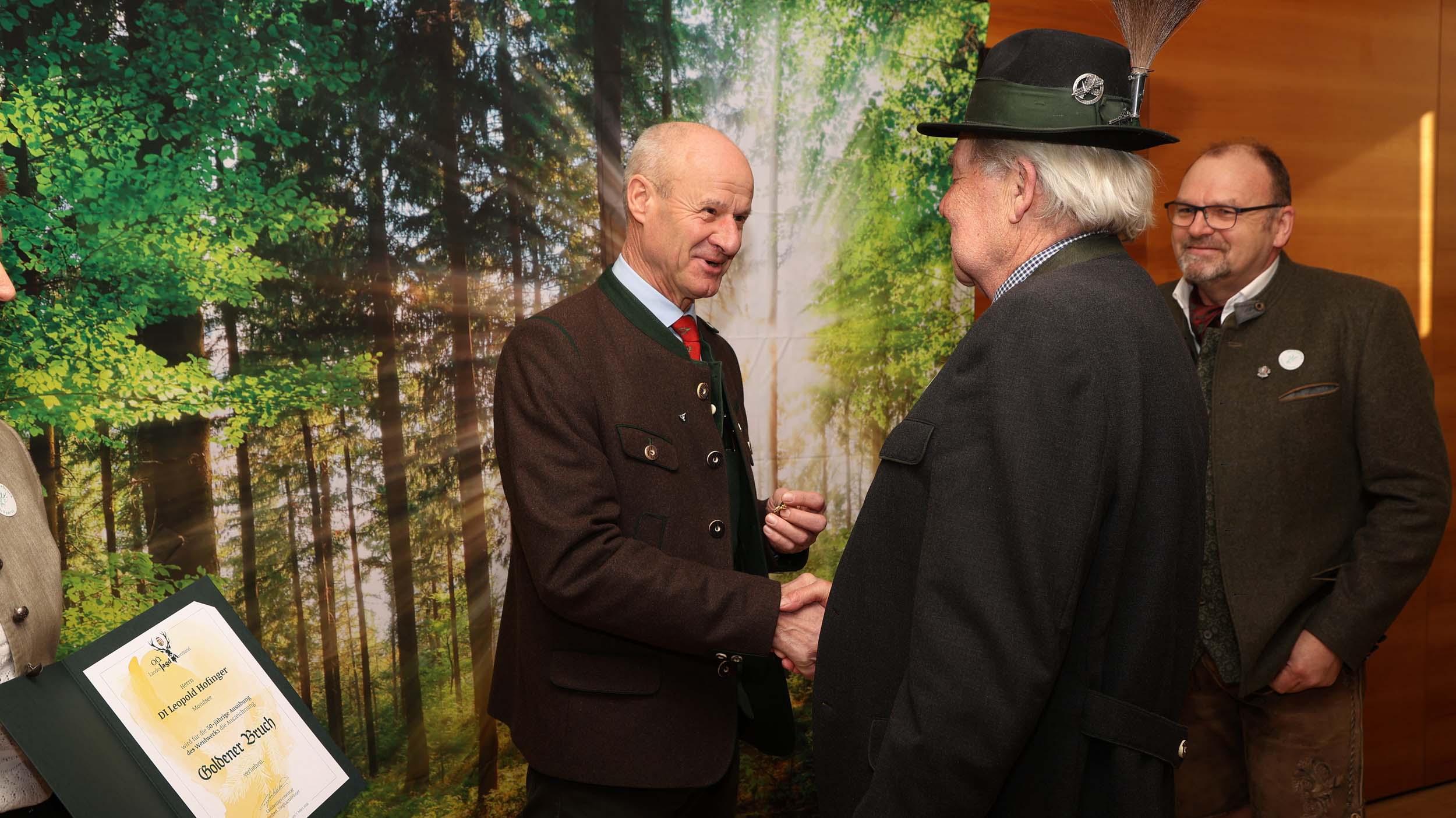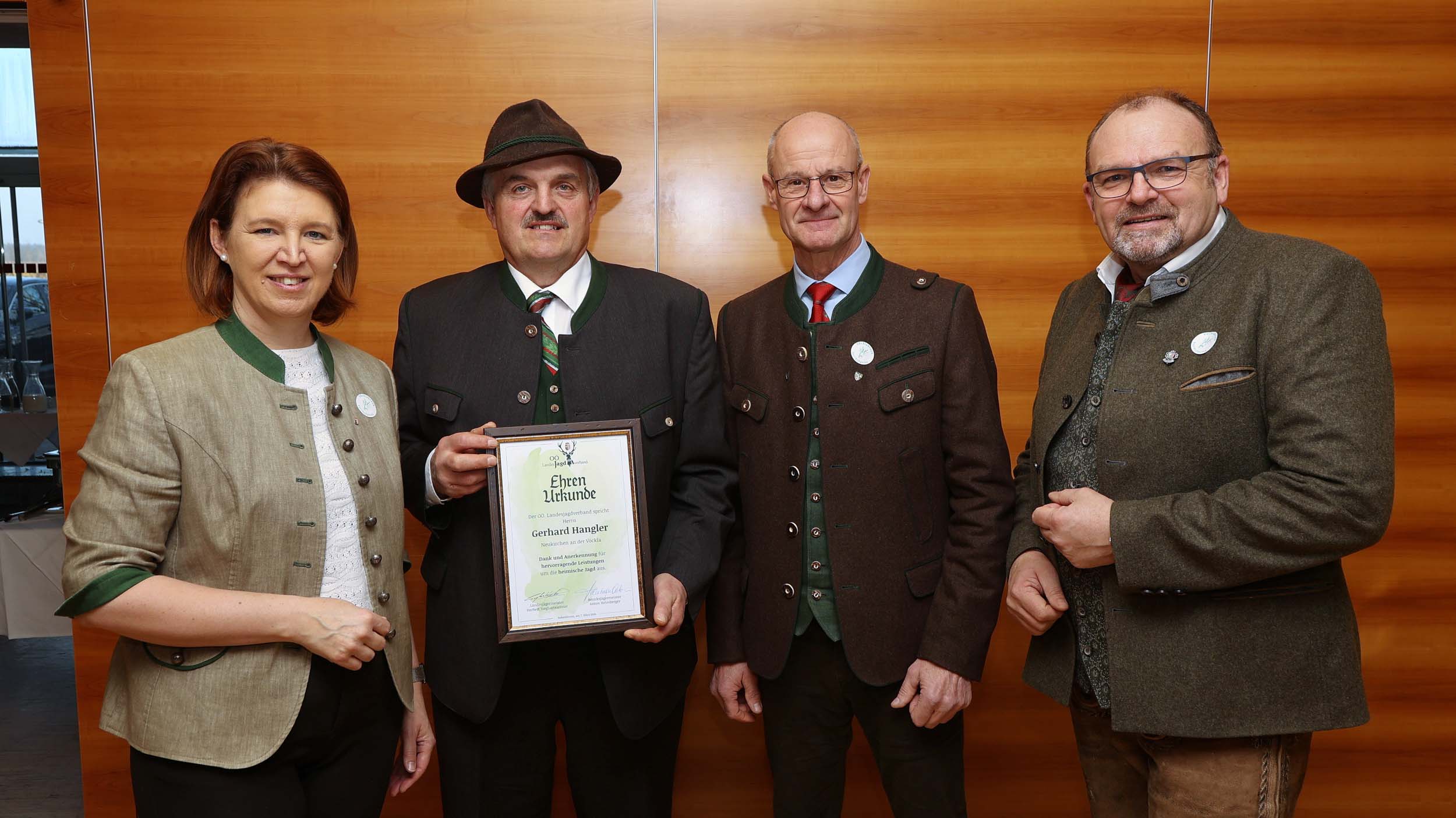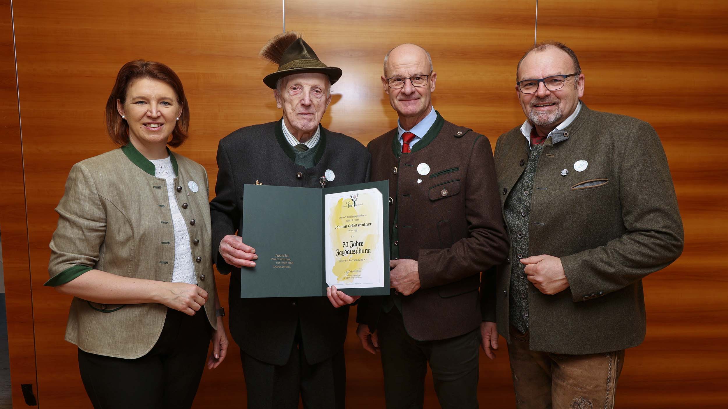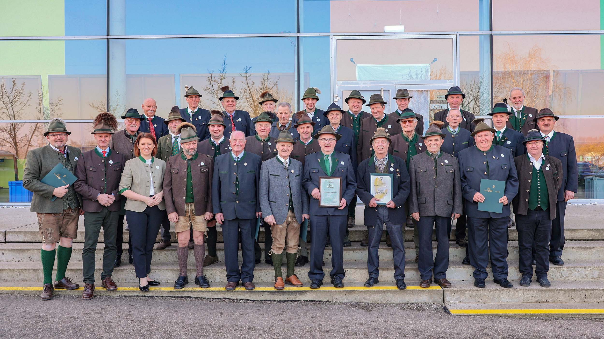 Im Rahmen des Bezirksjägertages wurden auch verdiente Jägerinnen und Jäger für ihr langjähriges Engagement ausgezeichnet. Verliehen an 32 Jäger des Bezirkes Vöcklabruck wurden unter anderem der Goldene Bruch für 50-jähriges Ausüben der Jagd, Ehrungen für 60 und 70 Jahre Mitgliedschaft in der Jägerschaft, Ehrenurkunden sowie Auszeichnungen wie die Raubwildnadel und Jagdhornbläserabzeichen.