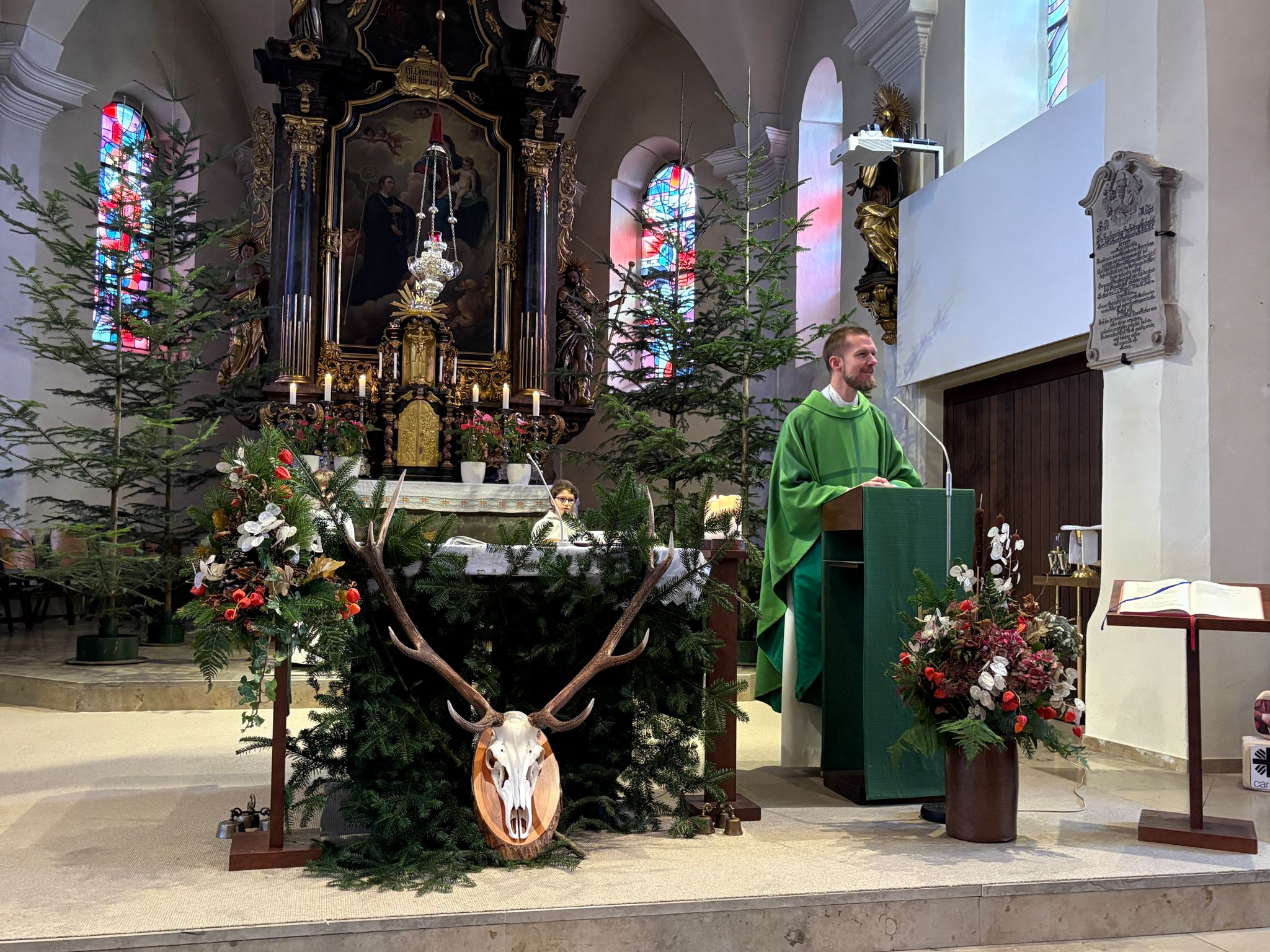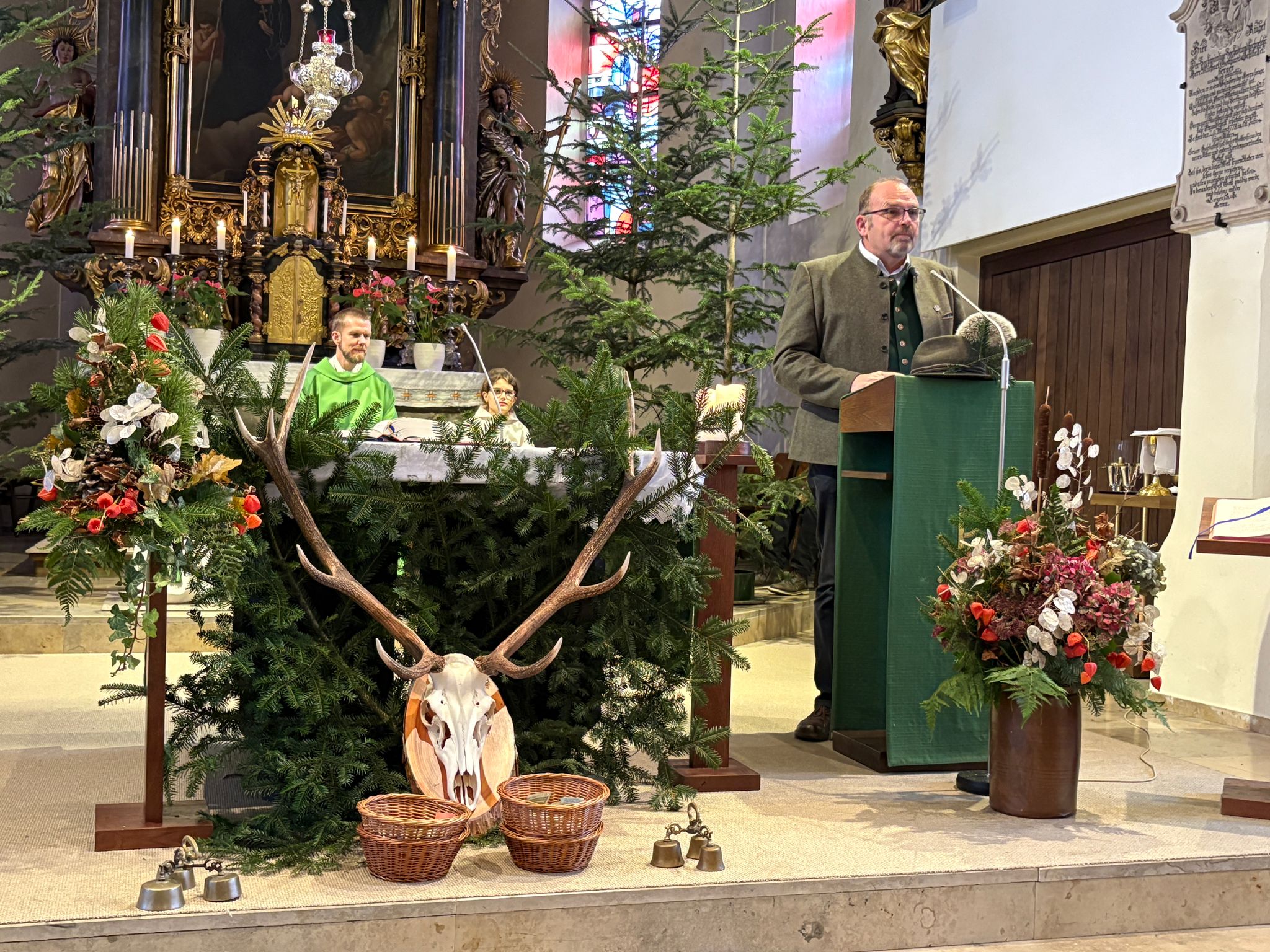 In seiner Predigt erinnerte Pfarrer Mag. Christoph Buchinger an den heiligen Hubertus, den Schutzpatron der Jägerinnen und Jäger. Die Legende erzählt von Hubertus, einem fränkischen Edelmann und leidenschaftlichen Jäger, dem bei der Jagd ein Hirsch mit einem leuchtenden Kreuz zwischen den Geweihen erschien. Dieses Erlebnis führte zu einem tiefgreifenden Umdenken: Jagd bedeutet nicht Herrschaft, sondern Dienst – Dienst an der Schöpfung, ausgeübt in Ehrfurcht und Verantwortung.