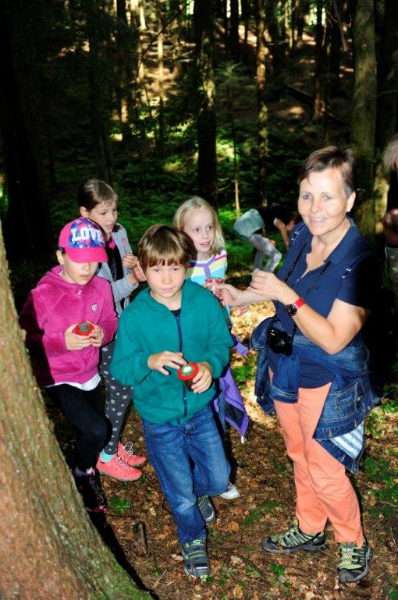Der Förster besuchte die größte Fichte des Waldes, um den Einfluss von Licht, Schatten und Nährstoffen zu erforschen. Laubfrösche, Erdkröten, Spinnen, Früchte und Pflanzen des Waldes zuzuordnen stießen dennoch auf Hindernisse, die von Ing. Christian Brunner mit vielen  verständlichen Worten erklärt wurden.