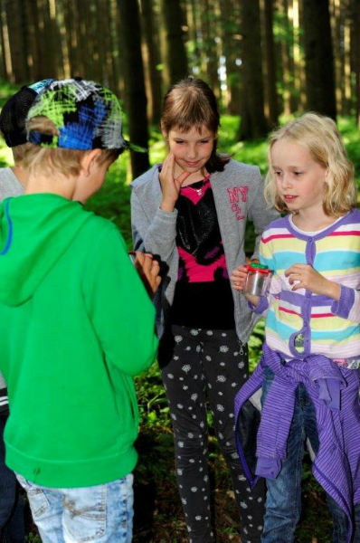 Der Förster besuchte die größte Fichte des Waldes, um den Einfluss von Licht, Schatten und Nährstoffen zu erforschen. Laubfrösche, Erdkröten, Spinnen, Früchte und Pflanzen des Waldes zuzuordnen stießen dennoch auf Hindernisse, die von Ing. Christian Brunner mit vielen  verständlichen Worten erklärt wurden.