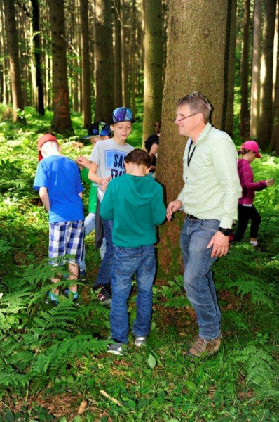 Der Förster besuchte die größte Fichte des Waldes, um den Einfluss von Licht, Schatten und Nährstoffen zu erforschen. Laubfrösche, Erdkröten, Spinnen, Früchte und Pflanzen des Waldes zuzuordnen stießen dennoch auf Hindernisse, die von Ing. Christian Brunner mit vielen  verständlichen Worten erklärt wurden.