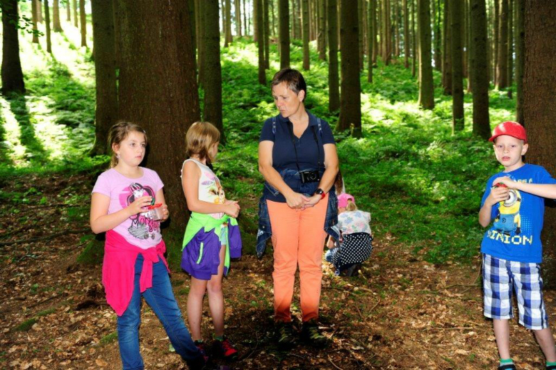 Der Förster besuchte die größte Fichte des Waldes, um den Einfluss von Licht, Schatten und Nährstoffen zu erforschen. Laubfrösche, Erdkröten, Spinnen, Früchte und Pflanzen des Waldes zuzuordnen stießen dennoch auf Hindernisse, die von Ing. Christian Brunner mit vielen  verständlichen Worten erklärt wurden.