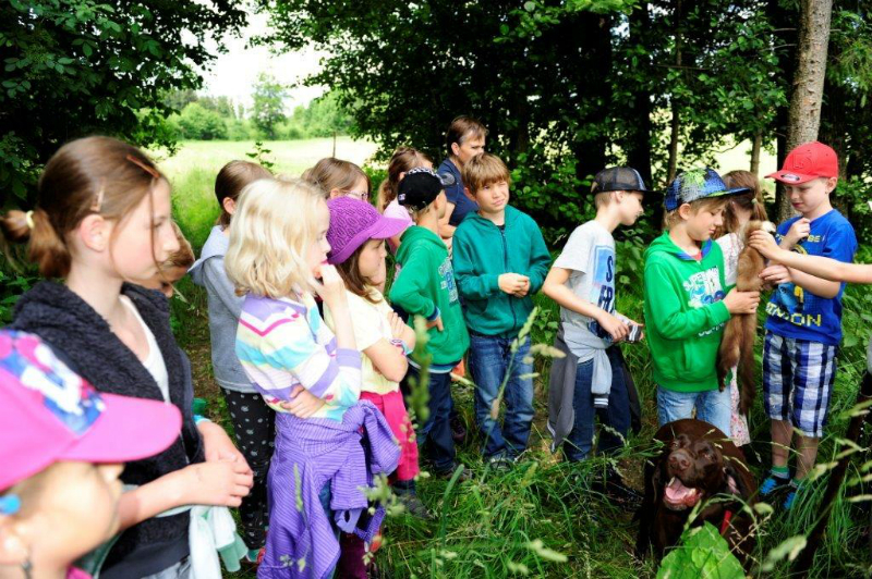 Mein Freund – der Jagdhund:  Hunde – Jagdhunderassen – Aufgaben – wie verhalte ich mich gegenüber einem Hund, sind Inhalte der zweiten Station. Hundeführer Herr Sitter und seine Weimaraner-Hündin sowie die Deutsch-Kurzhaarhündin waren schnell der Liebling aller Kinder. Jagdliche Aufgaben sowie die gesetzlich notwendigen Ausbildungsanforderungen in der Jagdhundeausbildung stellte die Deutsch-Kurzhaarhündin mit Freude und viel Eifer bei den Kindern unter Beweis.