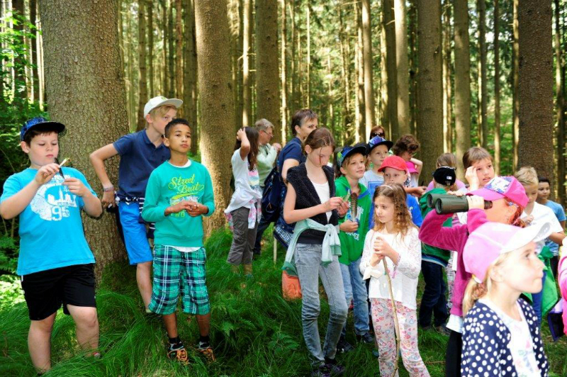 Der Förster besuchte die größte Fichte des Waldes, um den Einfluss von Licht, Schatten und Nährstoffen zu erforschen. Laubfrösche, Erdkröten, Spinnen, Früchte und Pflanzen des Waldes zuzuordnen stießen dennoch auf Hindernisse, die von Ing. Christian Brunner mit vielen  verständlichen Worten erklärt wurden.